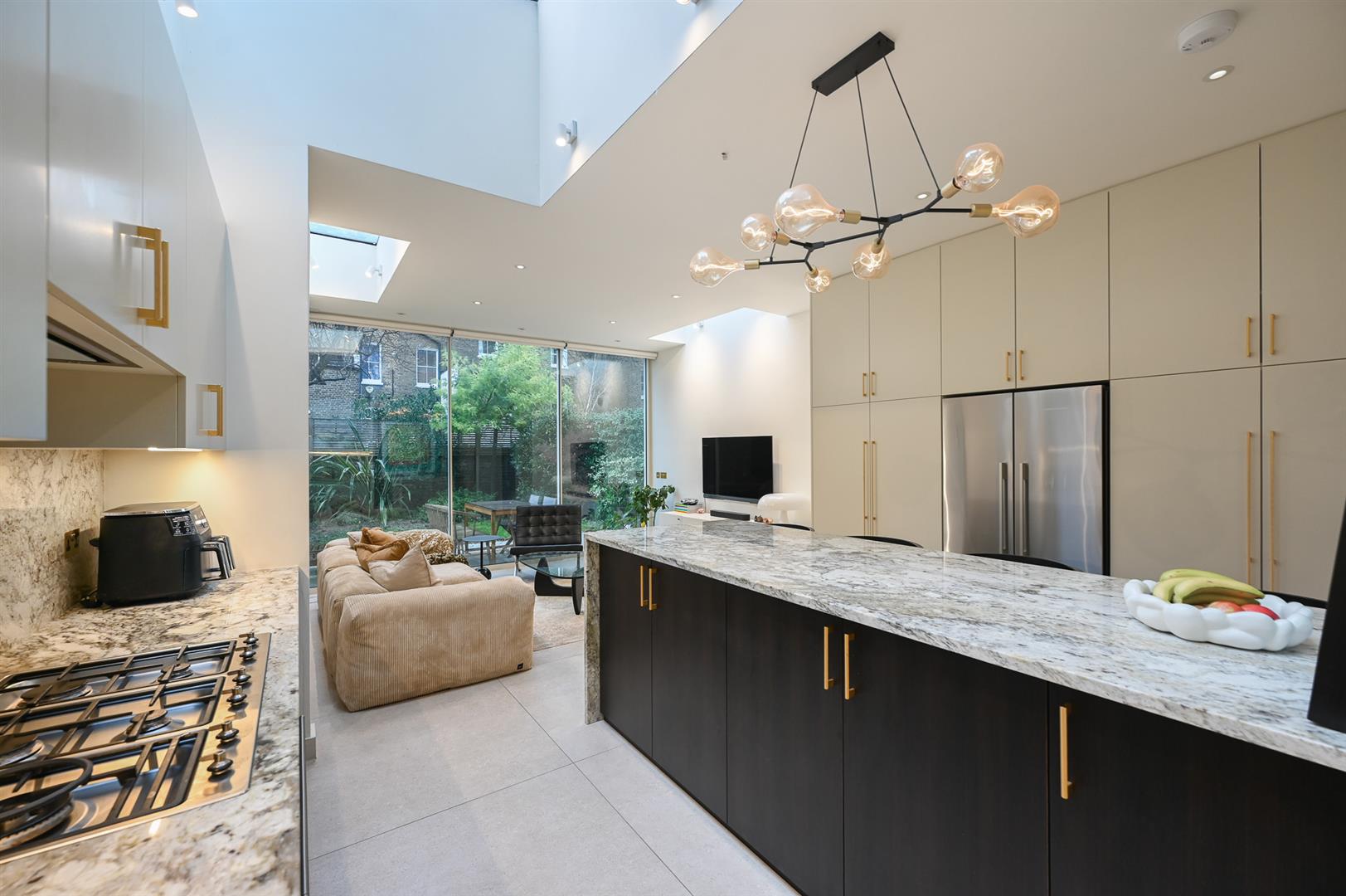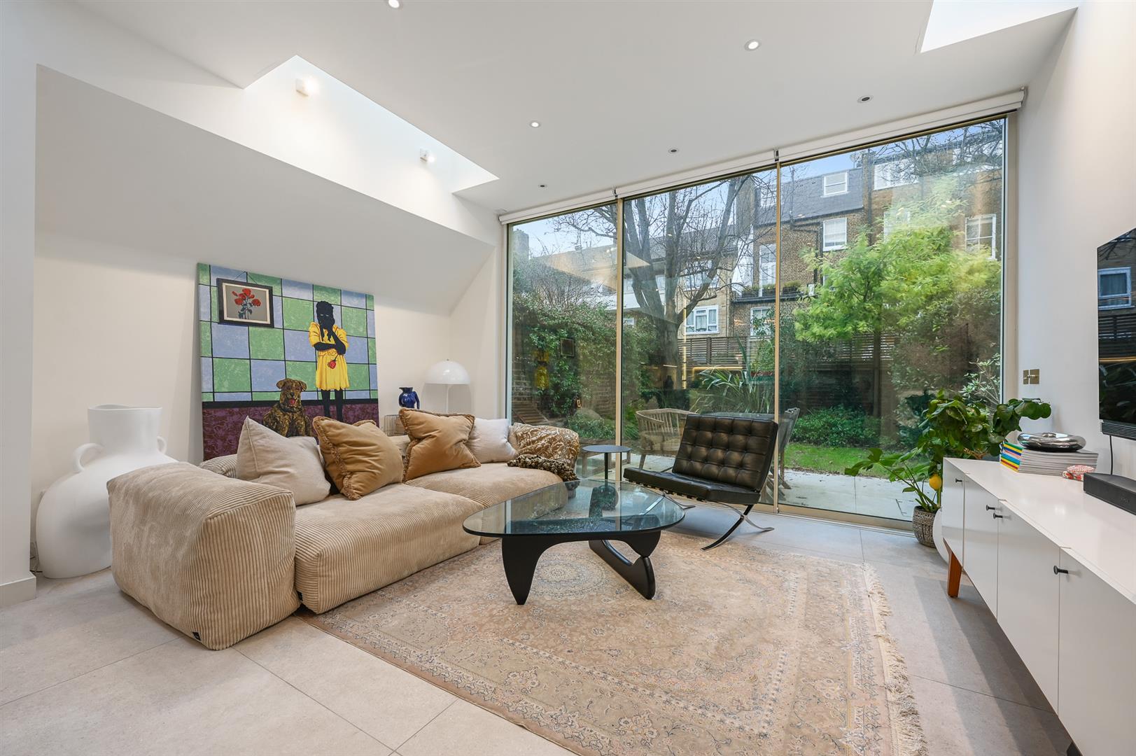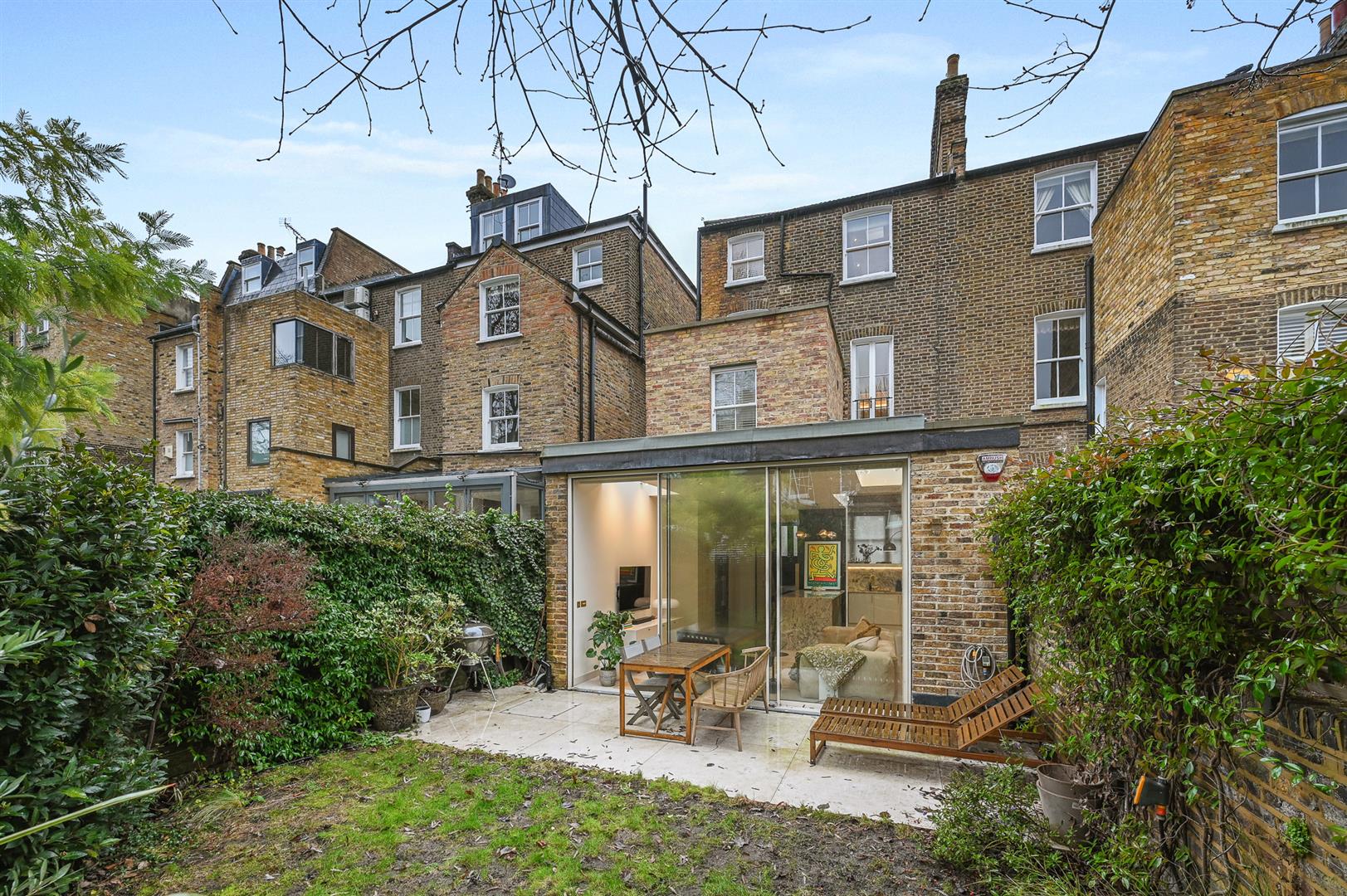 A fabulous, big-boned semi-detached Victorian house with excellent living/entertaining space on the ground floor and a secluded walled garden. The high-ceilinged double reception is accessed from the hall via floor to ceiling French doors; there is a bay window and feature fireplace to the front with an ‘open’ picture window to the rear overlooking the kitchen/breakfast/family room. Steps lead down to the bespoke full-width kitchen/breakfast/family room with floor to ceiling display cabinets; a marble topped island and abundant built-in storage. There is a TV/media room to the rear with floor to ceiling glass doors onto the garden which is initially paved then lawned with mature shrubs and trees. There is also useful side access. Steps lead down to the cellar where there is a guest cloakroom and additional storage space. There is a luxurious principal bedroom suite which occupies the entire first floor with a generous walk-in wardrobe complete with 2 walls of mirrored wardrobes and a bathroom with infra-red sauna. The top floor is currently configured as an open plan studio space with 3 sash windows to the front and vaulted ceilings, with an option to create a third bedroom by partitioning the existing space. There is a further shower room on the half landing on the 2nd floor. This impressive property combines traditional style with contemporary cool elegance. Melrose Gardens occupies an excellent position on this wide, tree-lined residential road and is within easy walking distance of Westfield London with its extensive retail, leisure and restaurant facilities together with the transport hubs at Shepherds Bush Green and Hammersmith Broadway. The much-anticipated London Olympia development with its vast cultural and fine dining offerings is also nearby.