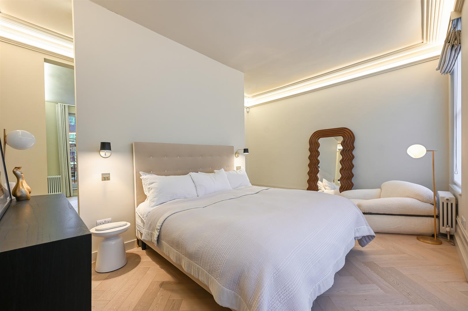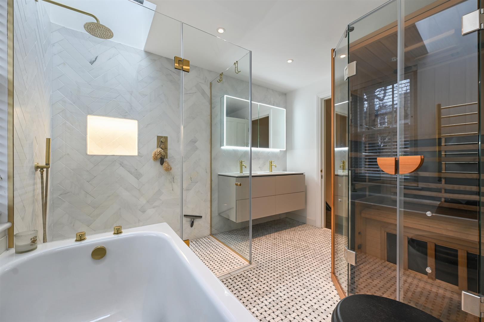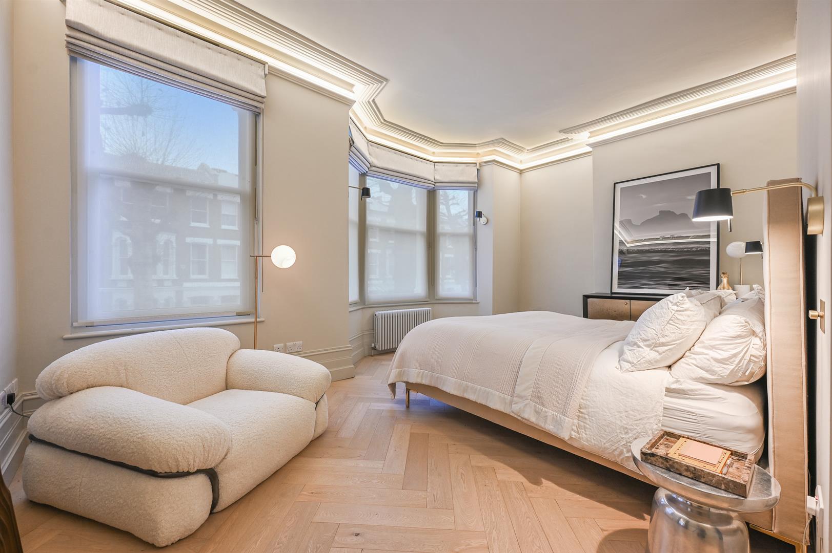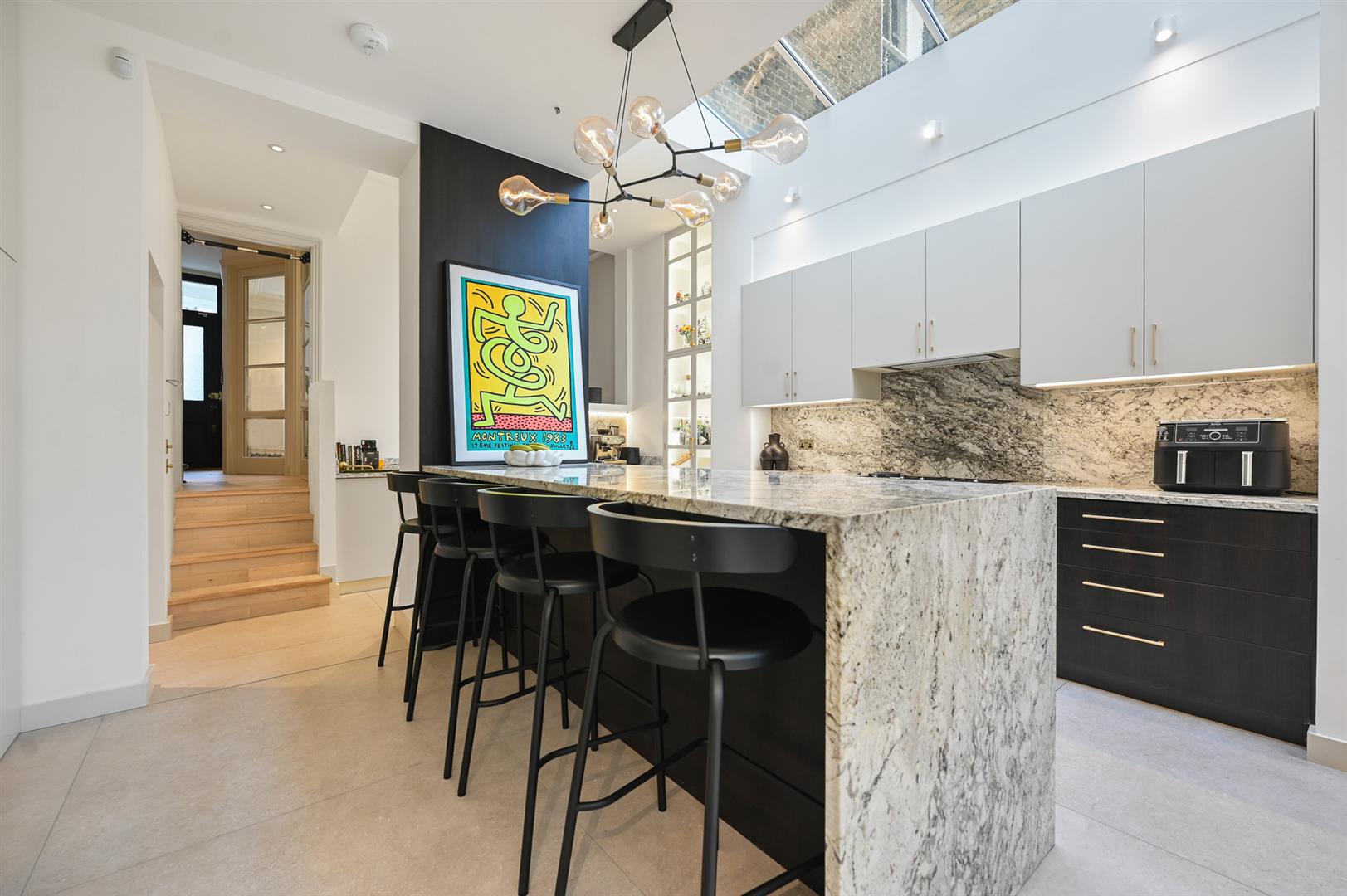 A fabulous, big-boned semi-detached Victorian house with excellent living/entertaining space on the ground floor and a secluded walled garden. The high-ceilinged double reception is accessed from the hall via floor to ceiling French doors; there is a bay window and feature fireplace to the front with an ‘open’ picture window to the rear overlooking the kitchen/breakfast/family room. Steps lead down to the bespoke full-width kitchen/breakfast/family room with floor to ceiling display cabinets; a marble topped island and abundant built-in storage. There is a TV/media room to the rear with floor to ceiling glass doors onto the garden which is initially paved then lawned with mature shrubs and trees. There is also useful side access. Steps lead down to the cellar where there is a guest cloakroom and additional storage space. There is a luxurious principal bedroom suite which occupies the entire first floor with a generous walk-in wardrobe complete with 2 walls of mirrored wardrobes and a bathroom with infra-red sauna. The top floor is currently configured as an open plan studio space with 3 sash windows to the front and vaulted ceilings, with an option to create a third bedroom by partitioning the existing space. There is a further shower room on the half landing on the 2nd floor. This impressive property combines traditional style with contemporary cool elegance. Melrose Gardens occupies an excellent position on this wide, tree-lined residential road and is within easy walking distance of Westfield London with its extensive retail, leisure and restaurant facilities together with the transport hubs at Shepherds Bush Green and Hammersmith Broadway. The much-anticipated London Olympia development with its vast cultural and fine dining offerings is also nearby.