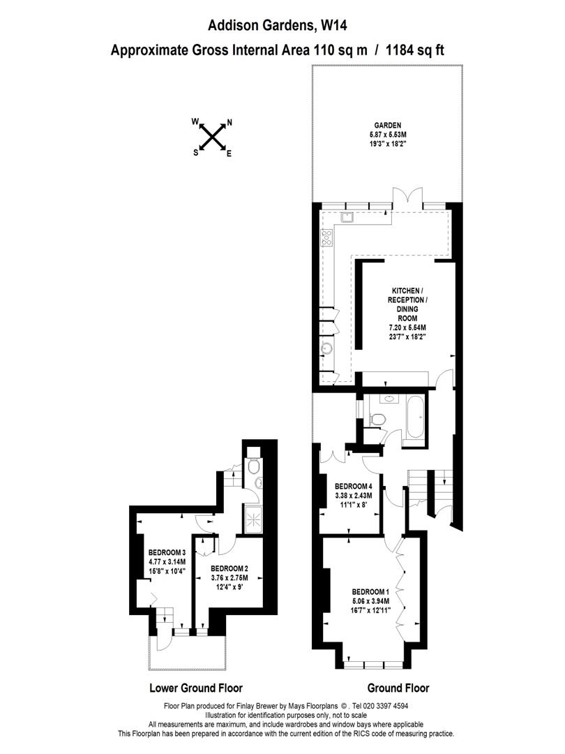 The generous reception is to the rear with original wood floorboards and is open to the L-shaped galley-style kitchen which wraps around the reception. There are French doors from the kitchen opening onto the garden which is initially paved and then decked. The principal bedroom is to the front of the ground floor with a box bay window and extensive built-in wardrobes. The 2nd bedroom is behind and has French doors onto the lightwell. There is also a generous bathroom on this floor. There are 2 further bedrooms and a shower room on the lower ground floor. This property of approximately 1184 sq ft provides potential to upgrade to one’s own taste and style, occupies a wonderful position on the sought-after Addison Gardens and is within easy walking distance of the transport hubs of Hammersmith Broadway, Shepherds Bush Green and Westfield London.