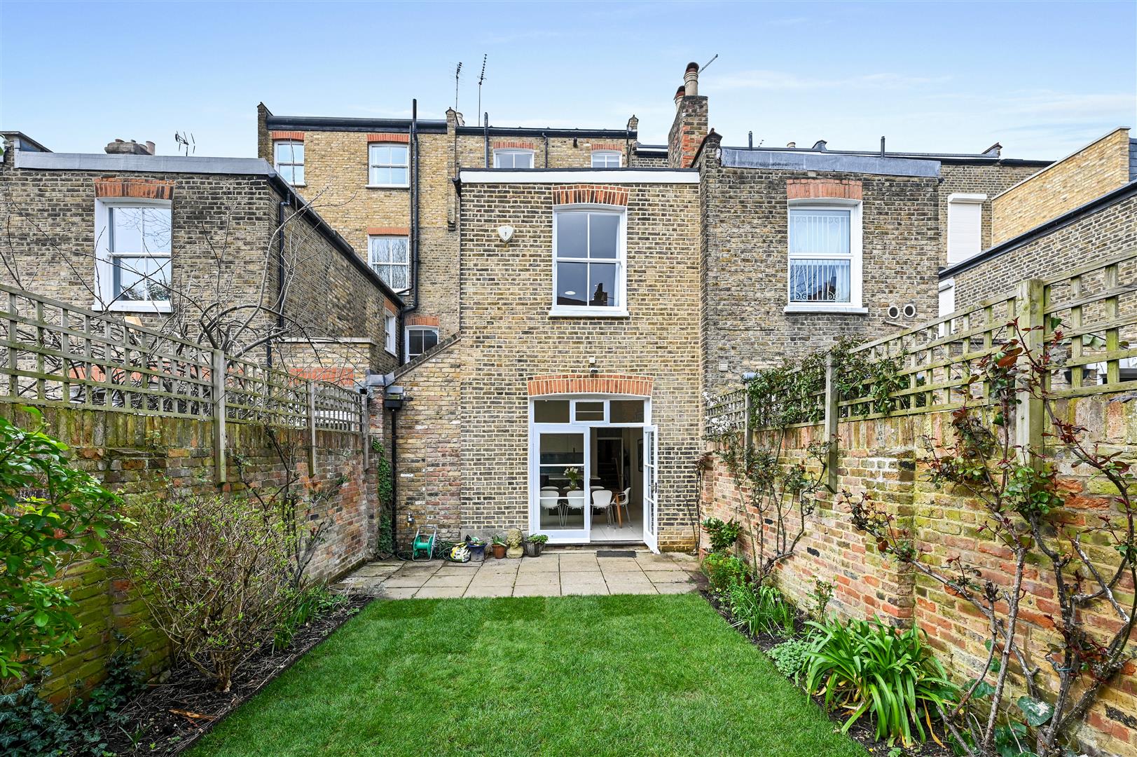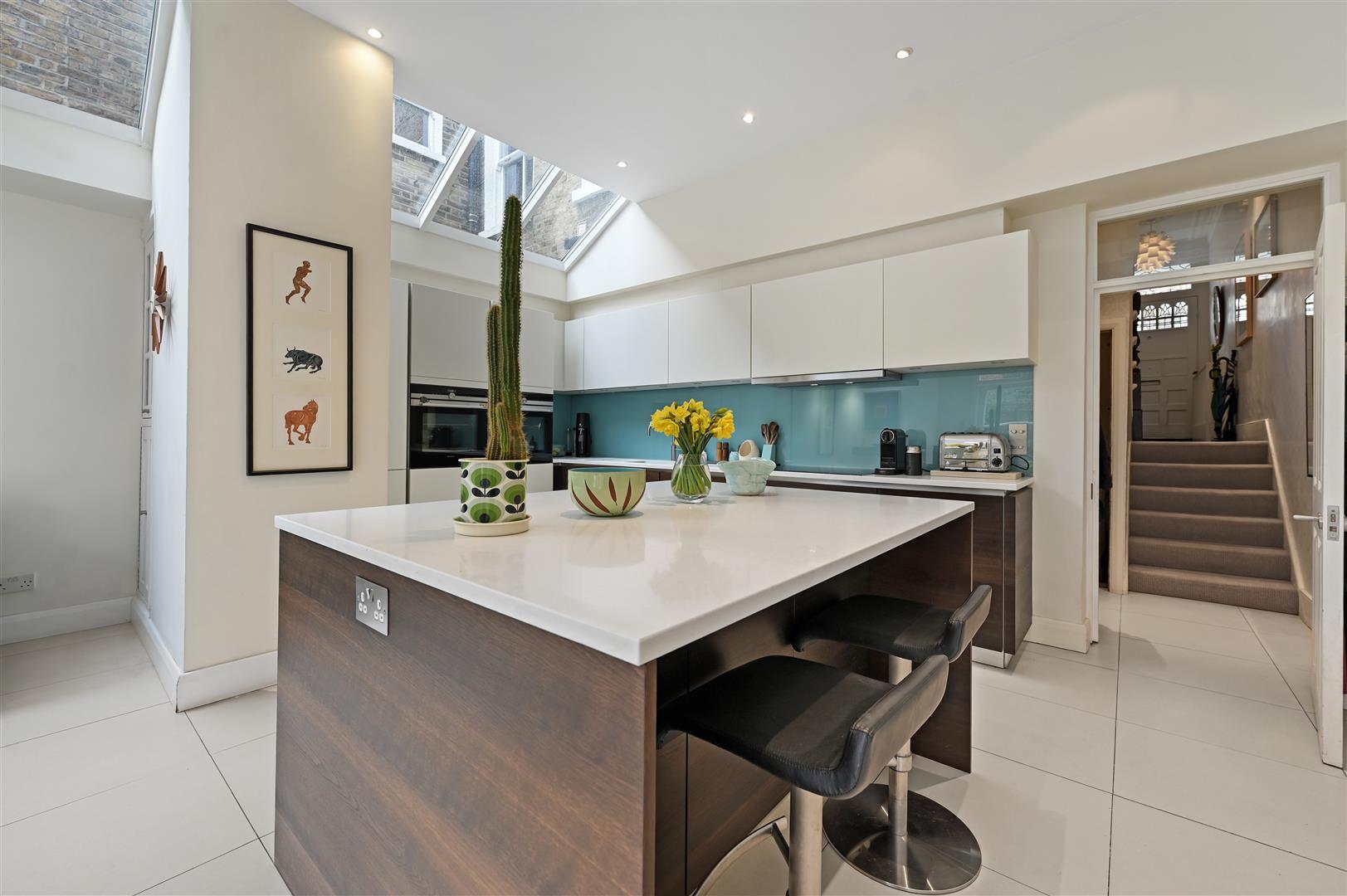 A truly fabulous 4/5 double bedroom late Victorian house with excellent and flexible living/entertaining space over 2 floors and a lovely south easterly garden. There is a high-ceilinged, elegant reception to the front of the ground floor with a square bay window, feature fireplace with shelving, dwarf cupboards and original stripped wood floor. Steps lead down to the deep, full width kitchen/breakfast family room which has a fully ceramic tiled floor, island and French doors to the garden which is initially paved then lawned with mature shrub surrounds. There is also a good sized utility room, separate guest cloak room and access to the very useful full width cellar storage. There is a 2nd full width formal reception/bedroom to the front of the first floor with triple and single sash windows to the front, feature fireplace and floor to ceiling shelving with dwarf cupboards. There are 4 further double bedrooms and 3 bathrooms including the fabulous principal bedroom suite which occupies the rear of the first half landing with en suite bathroom and abundant built in cupboards. This big boned and generously proportioned family house occupies an excellent position on the street and has a wonderful feel. The lower ground / basement could be further excavated subject to the usual planning consents as others have done on the street.