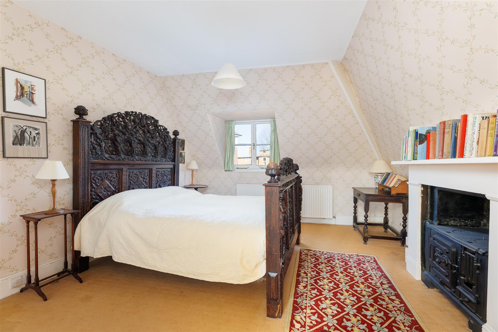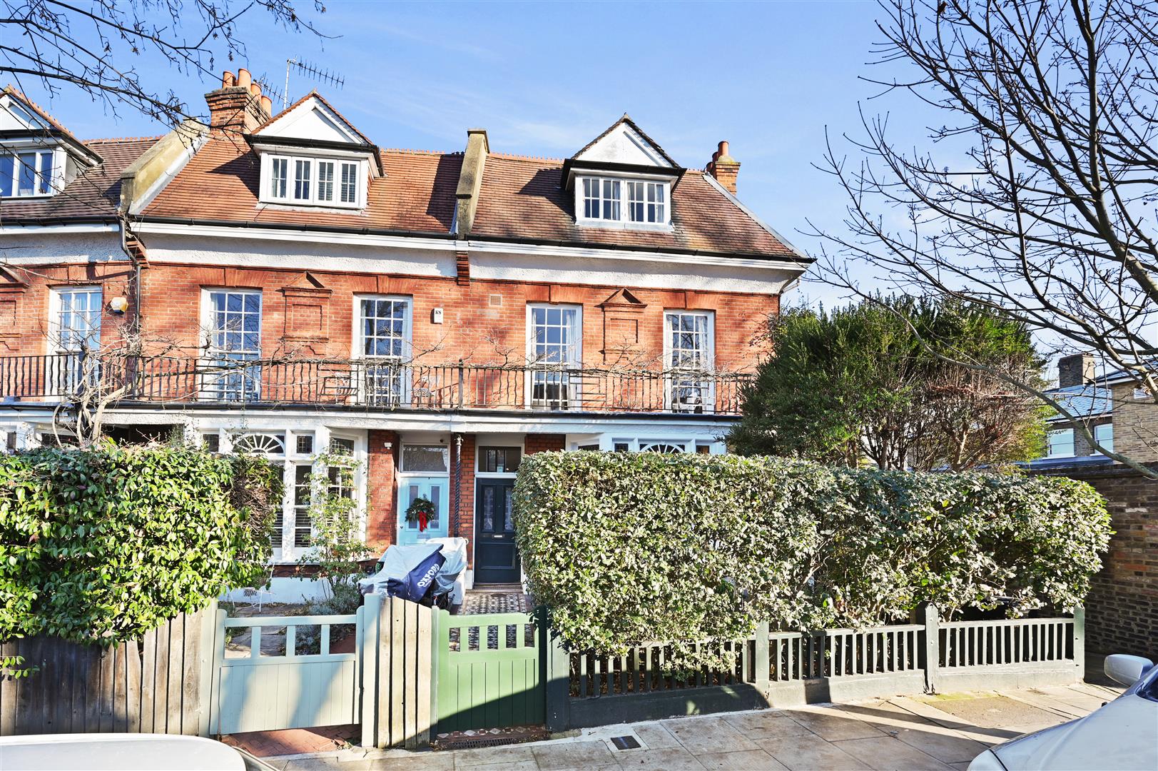 A wonderful 4 bedroom end of terrace Victorian house with very good living/entertaining space on the ground floor, a private walled rear garden as well as a front garden and a garage with off street parking for 1 car. There is an elegant, extra-wide double reception on the ground floor with feature bay window, marble fireplace and stripped original floorboards. There are French doors to the rear with steps down to the wide side return, garden and entrance to the rear of the garage. This entertaining space also has interconnecting wide double doors to create 2 separate rooms if required. Steps lead down from the hallway to the kitchen/breakfast room to the rear with French doors and a window to the side and a wide bay window to the rear overlooking the garden with built-in banquette seating below. The private garden is paved and walled with mature shrubs and enjoys an open aspect. There is access to generous cellar storage and a guest cloakroom from the hallway. There are 4 bedrooms, 2 bathrooms, a guest cloakroom and a study on the upper floors including the fabulous principal bedroom suite which occupies the entire first floor with the full width bedroom to the front where there are 2 floor-to-ceiling sash windows which open onto the full width railed balcony, extensive built-in cupboards and a generous en suite bathroom behind with feature fireplace and sash window over the garden. This truly delightful property has an abundance of original features whilst also offering enormous potential to upgrade and refurbish to one’s own taste and style. Located at the end of a pretty cul-de-sac moments from Ravenscourt Park the property has the added considerable advantage of being the only property on this sought-after residential road to have off street parking and a garage.