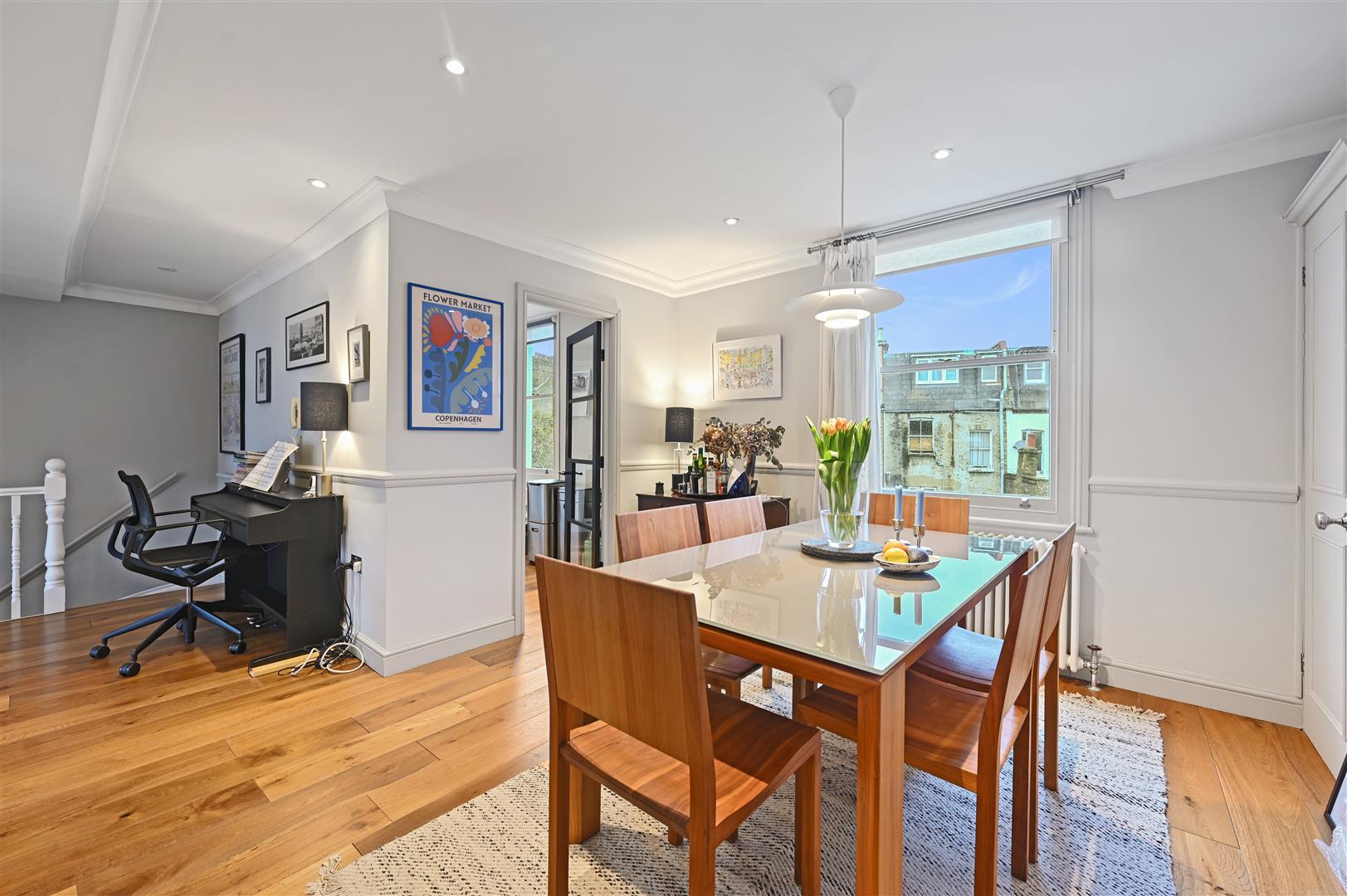 The large open-plan reception is flooded with natural light from north- and south-facing sash windows and offers ample space for relaxing and dining, with a separate kitchen adjoining.