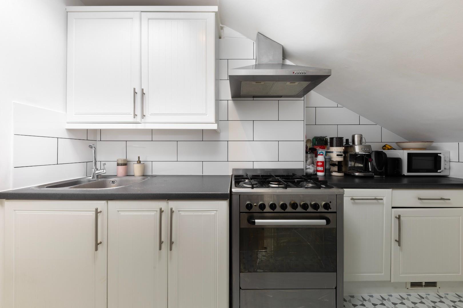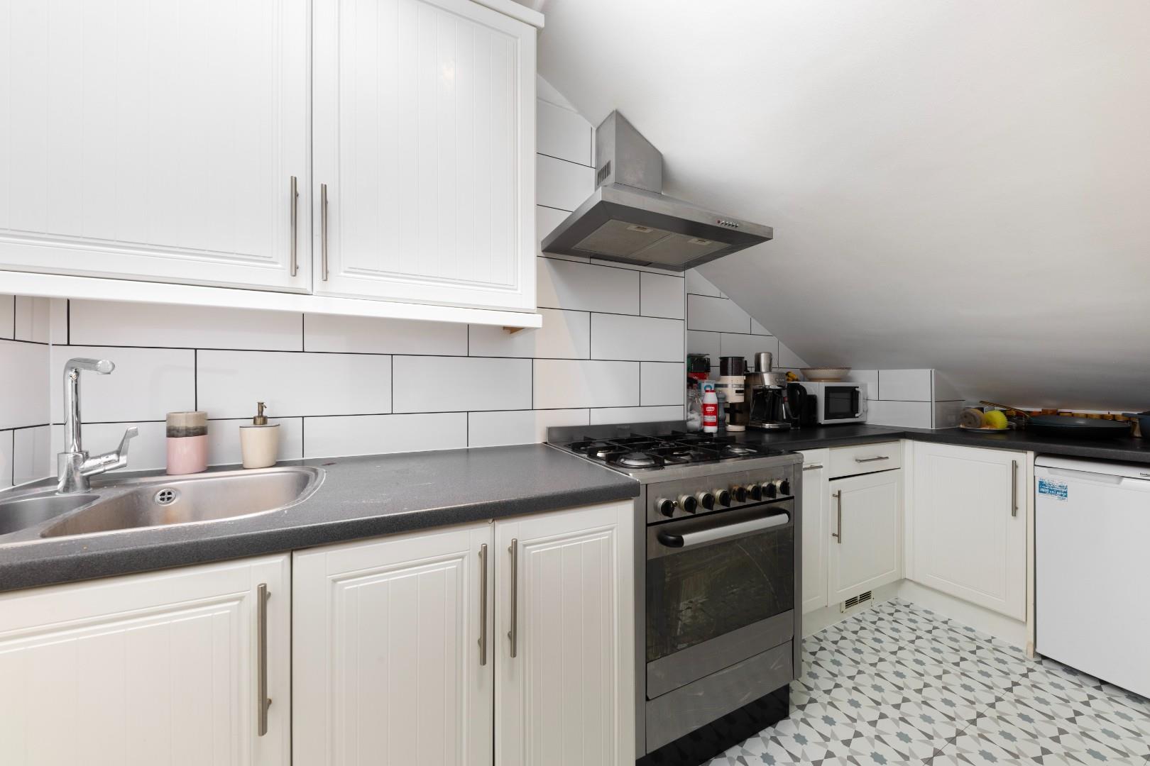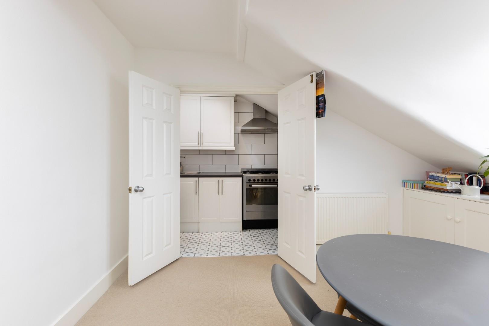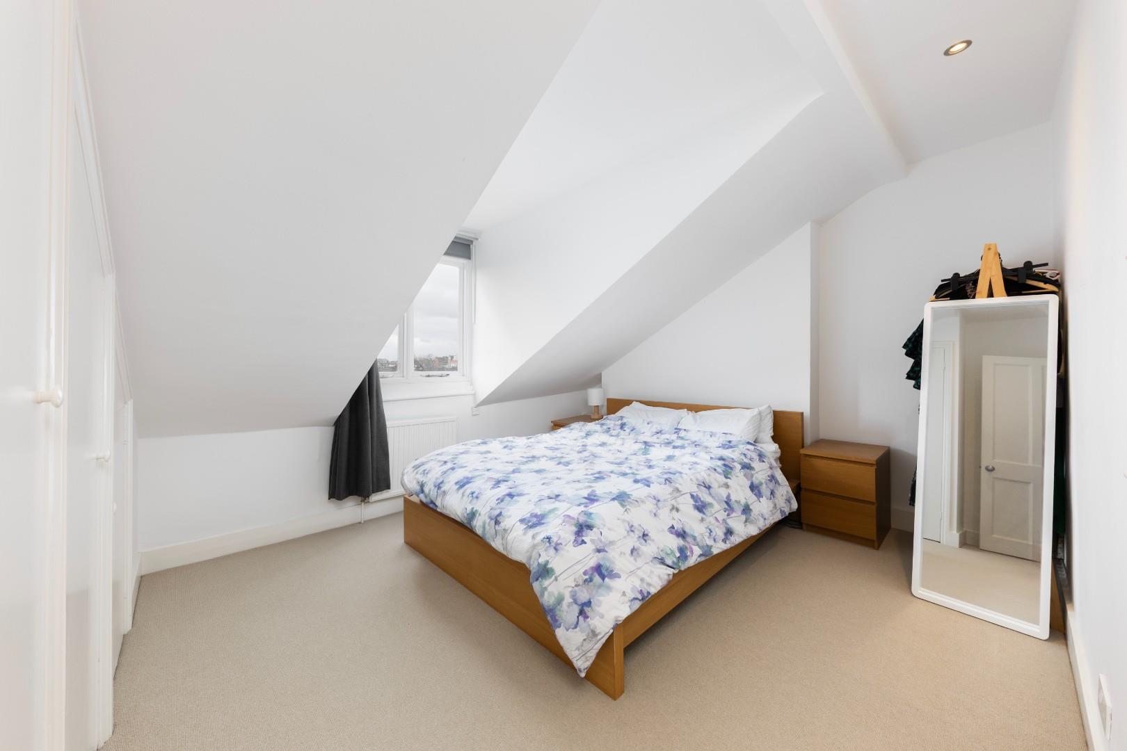 A generous 2 double bedroom apartment situated on the third floor of an imposing Victorian conversion. The generous reception/kitchen/dining room to the front has large dormer windows and extensive dwarf cupboards, there are double doors to the well equipped kitchen. There is also potential to explore a roof conversion (such as a mansard), which could increase headroom on both sides of the flat and may allow for an enlarged bedroom layout, subject to the usual consents. The principal bedroom to the rear is spacious, with ample built in storage and fantastic southerly views over Brook Green. There is a second bedroom beside with storage. A useful cupboard is located on the landing, providing additional practical storage space. The bathroom is on the half landing. This property of approximately 764 sq ft is fantastically bright and is exceptionally well-located for the incredible £1.3 billion Olympia Development and a plethora of gastro pubs and cafes in Brook Green Village.